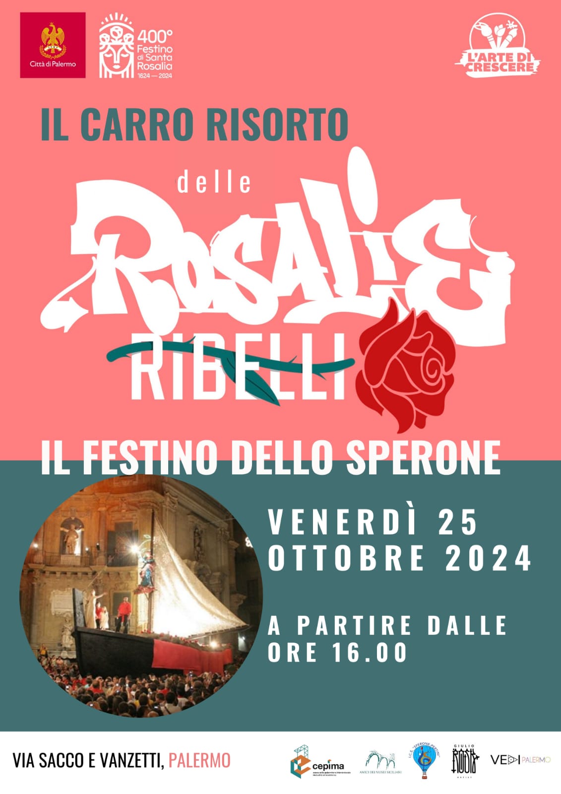 L’iniziativa "Il Carro risorto delle Rosalie ribelli” è promossa dalle associazioni L’Arte di Crescere e Amici dei Musei Siciliani e dall ICS"Sperone-Pertini" e rientra tra gli eventi collaterali al 400° Festino Di Santa Rosalia. L’iniziativa “Il Carro risorto delle Rosalie ribelli” porta a sintesi due diverse progettualità, “Le Rosalie Ribelli" e “Il Carro risorto”, con l’intenzione di coniugare la tradizione della Santa Patrona di Palermo con la crescita morale, civile, sociale e culturale delle cittadine e dei cittadini di Palermo dei giorni nostri.