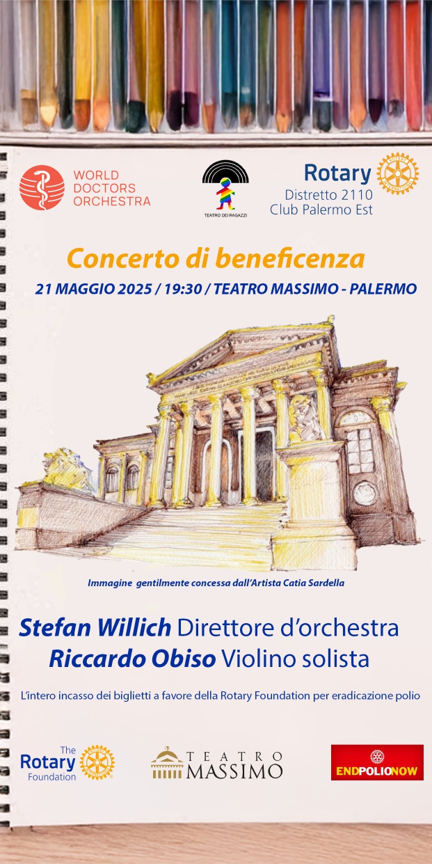 Un concerto di beneficenza che servirà a raccogliere fondi per sconfiggere la poliomelite, una malattia che, grazie agli sforzi congiunti a livello mondiale, è vicina alla sua completa eradicazione. Lo terrà alle 19.30 di mercoledì 21 maggio al Teatro Massimo di Palermo la prestigiosa World Doctors Orchestra, orchestra sinfonica unica al mondo, composta in questa occasione da oltre 70 medici-musicisti (selezionati tra oltre 2000 richieste) provenienti da diversi Paesi del Mondo.Professionisti della medicina, che uniscono la loro passione per la musica a un profondo impegno umanitario, esibendosi in tutto il mondo per sostenere cause benefiche fondamentali. La loro presenza a Palermo, al fianco del Rotary Palermo Est e dell' associazione di Promozione Sociale Teatro dei ragazzi Palermo, che promuovono l’evento,   testimonia l'importanza e il valore di questa iniziativa congiunta. L’iniziativa e il progetto saranno presentati alle 12 di lunedì 19 Maggio a Palazzo Palagonia, in via del IV Aprile. Saranno presenti: il direttore d'Orchestra della World Doctors Orchestra, Prof. Stefan Willich; il sindaco di Palermo, Roberto Lagalla; Fabio Tulone, presidente del club Rotary Palermo Est; Pia Tramontana, presidente dell’APS Teatro dei Ragazzi.