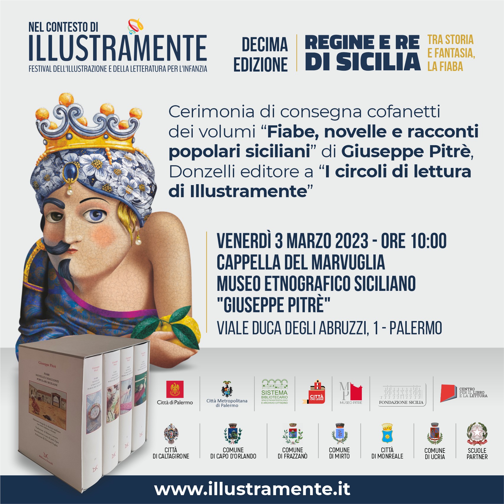 Venerdì 3 marzo alle ore 10.00 nella Cappella del Marvuglia del Museo Pitrè (viale Duca degli Abruzzi,1) nell’ambito della decima edizione di "Illustramente", festival dell’illustrazione e della letteratura per l’infanzia, sul tema “Regine e re di Sicilia. Tra storia e fantasia, la fiaba” (17/20 novembre 2022- 22/26 maggio 2023), si svolgerà la cerimonia di consegna dei cofanetti contenenti i volumi delle “Fiabe, novelle e racconti popolari siciliani” di Giuseppe Pitrè, Donzelli editore – che saranno donati  ai Circoli della lettura di Illustramente.
