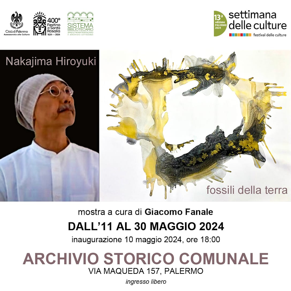 Nell'ambito della tredicesima edizione del Festival Settimana delle Culture,  all'Archivio storico comunale di Palermo in via Maqueda n.157, da domani sabato 11 maggio e fino a giovedì 30 maggio, sarà visitabile la mostra  dell' artista e calligrafo giapponese Nakajima Hiroyuki dal titolo " Fossili della Terra" curata da Giacomo Fanale.