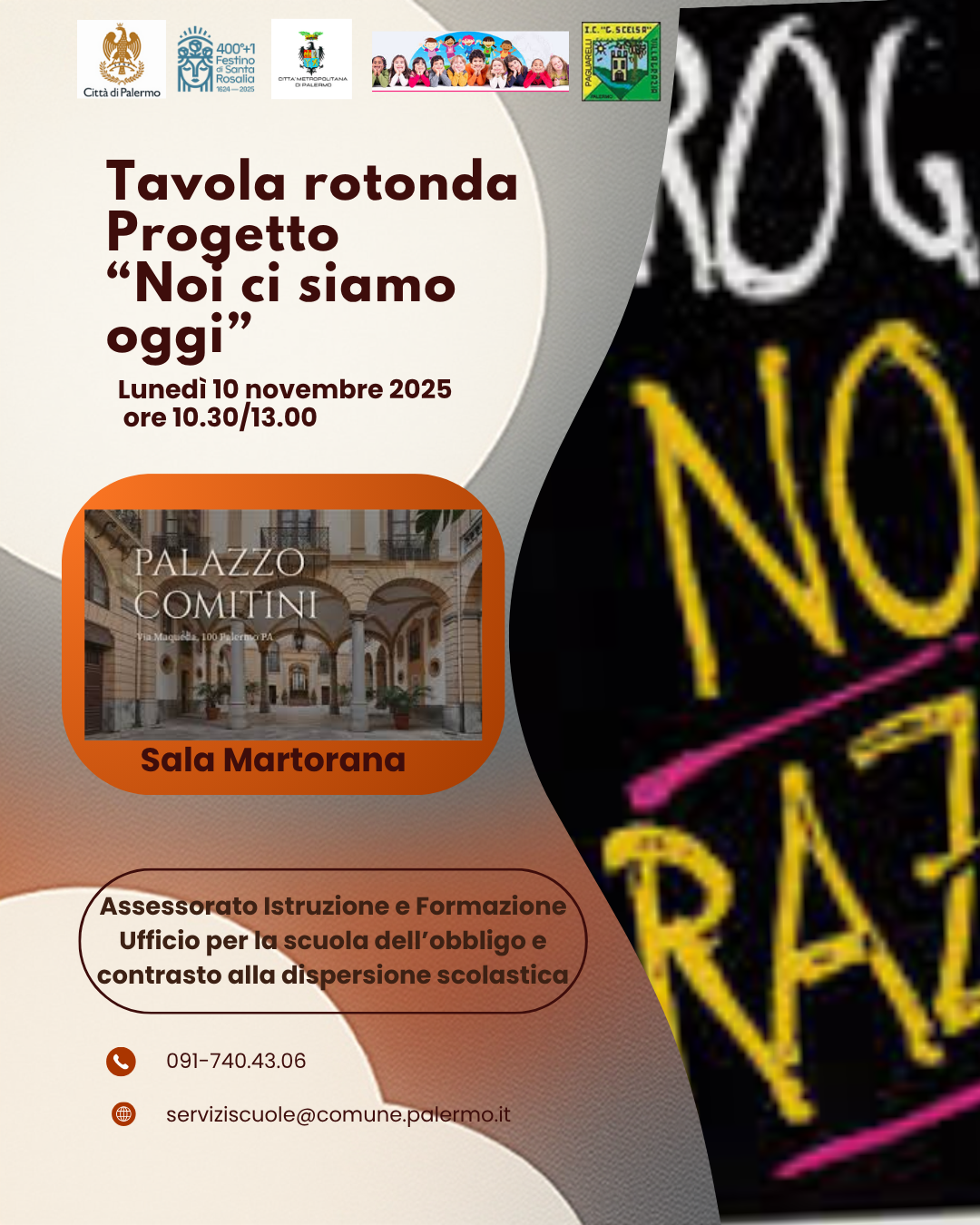 Lunedì 10 novembre, dalle ore 10.30 alle ore 13.00, presso la Sala Martorana di Palazzo Comitini, si terrà una Tavola Rotonda in cui verrà presentato il progetto "Noi ci siamo oggi", finanziato nell'ambito del Fondo interministeriale per la legalità e per la tutela degli amministratori locali vittime di atti intimidatori (art.1, comma 589, della legge 30 dicembre 2021, n. 234).
