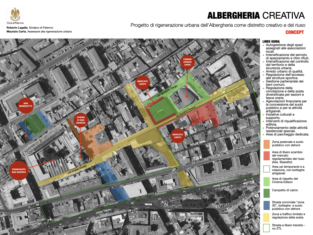 Il progetto di rigenerazione urbana dell’Albergheria è stato discusso, per le sue diverse componenti operative, con l’Assessore alle attività produttive, Giuliano Forzinetti, con l’Assessore allo sport, Alessandro Anello, con l’Assessore alla viabilità ordinaria, Dario Falzone, nonché con il Presidente del Consiglio Comunale, Giulio Tantillo, il consigliere Salvatore Imperiale, presidente della Commissione Consiliare “Igiene e Sanità, Solidarietà Sociale”, e il Consigliere Ottavio Zacco, presidente della Commissione Consiliare “Programmazione, Sviluppo economico e attività produttive”, per le conseguenti deliberazioni programmatore e regolamentarie del Consiglio Comunale. Tutti quanti, con grande competenza e sensibilità, hanno partecipato attivamente ai sopralluoghi e agli incontri per definire il programma e individuare le soluzioni più efficaci.