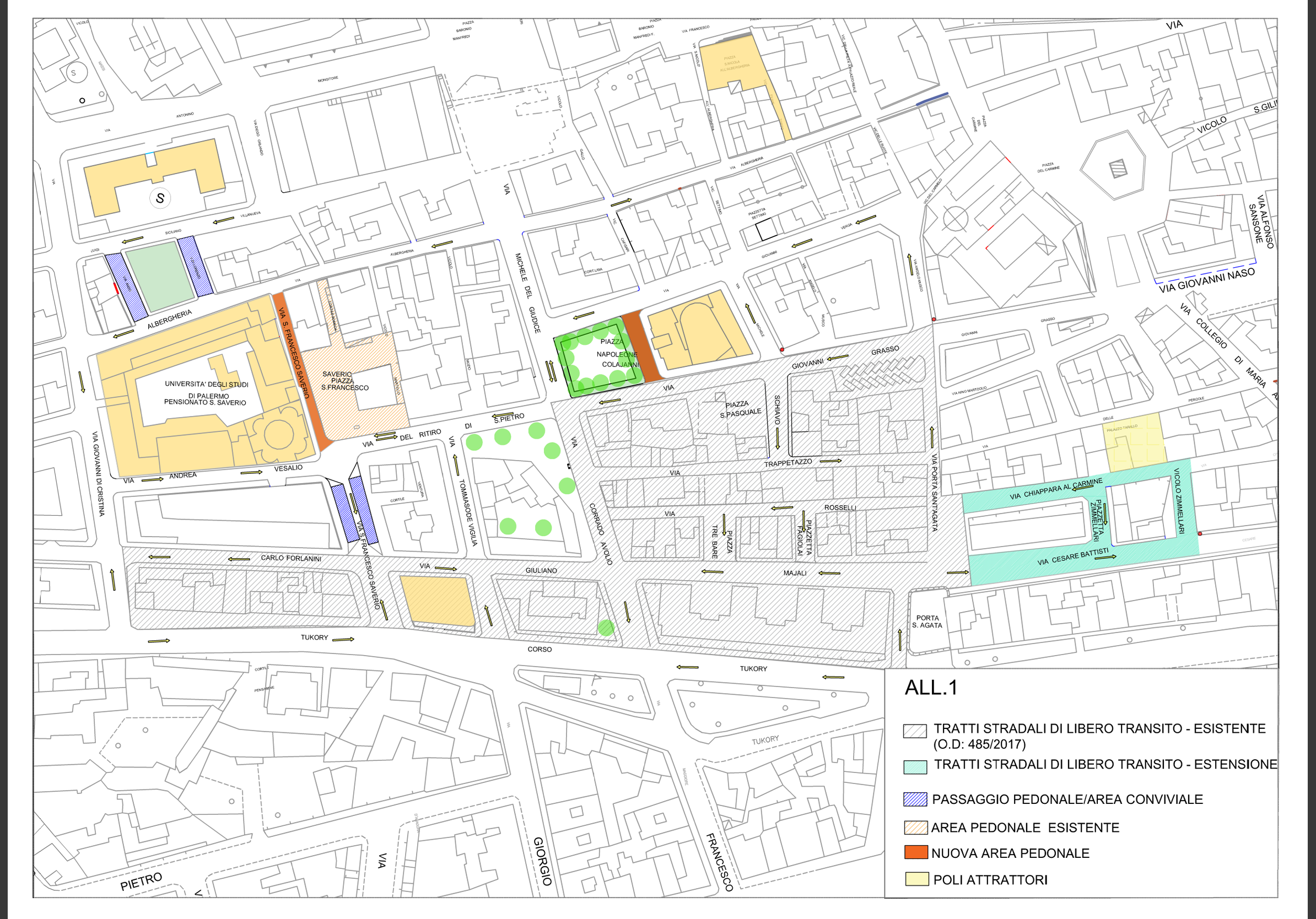 La delibera prevede principalmente la pedonalizzazione della via San Francesco Saverio, della strada tra piazza Napoleone Colajanni e l’ex Cinema Edison e delle via Andò e Di Lorenzo.