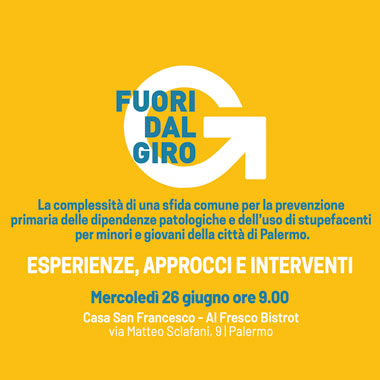 Domani, mercoledì 26 giugno ore 9.00, presso Casa San Francesco - Al Fresco Bistrot (via Matteo Sclafani, 9), le realtà territoriali del progetto “Fuori dal giro” organizzano un incontro per dialogare, testimonianze e numeri alla mano, della complessità di una sfida comune in risposta all’emergenza stupefacenti e dipendenze patologiche che riguarda anche giovani e minori a Palermo. L'incontro mette in connessione le esperienze e i percorsi delle equipe di psicologi, mediatori, assistenti sociali, educatori di strada e operatori dell'ASP attivi nei presidi mobili, testimoni privilegiati delle conseguenze di un fenomeno emergenziale pervasivo.