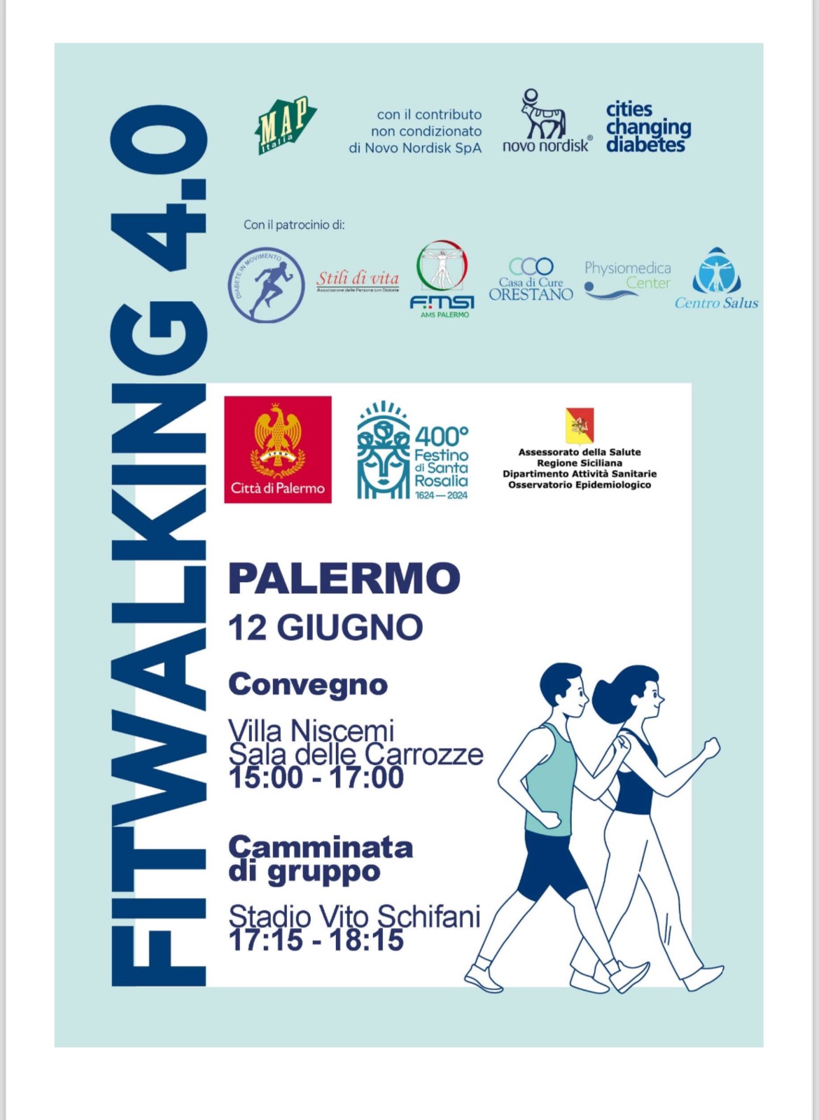 Domani (mercoledì 12 giugno) alle 15 a Villa Niscemi si presenta il progetto Walking Friends 4.0 - nell'ambito dell’iniziativa mondiale Cities changing diabetes - per promuovere anche a Palermo la "camminata sportiva" fitwalking come attività fisica terapeutica in particolare per chi soffre di diabete e obesità.