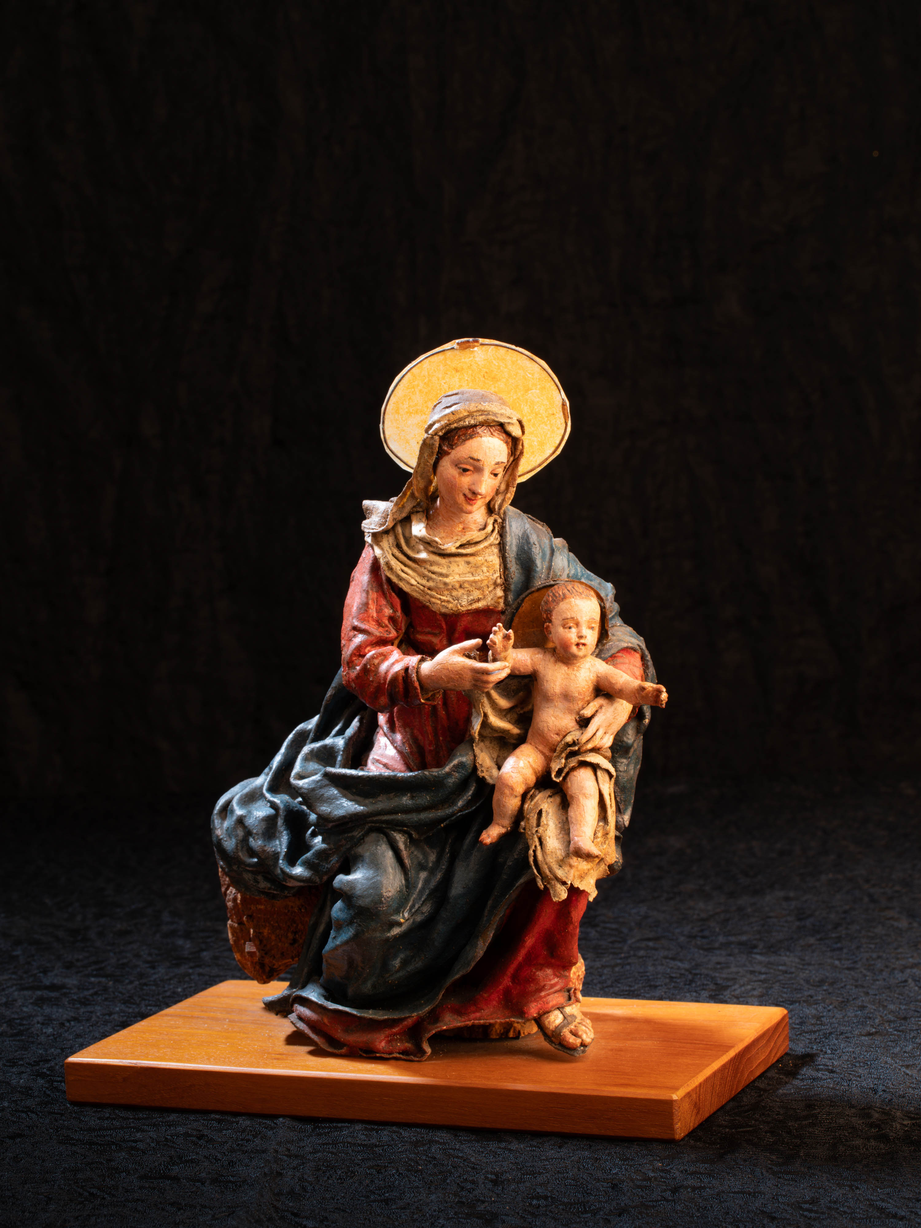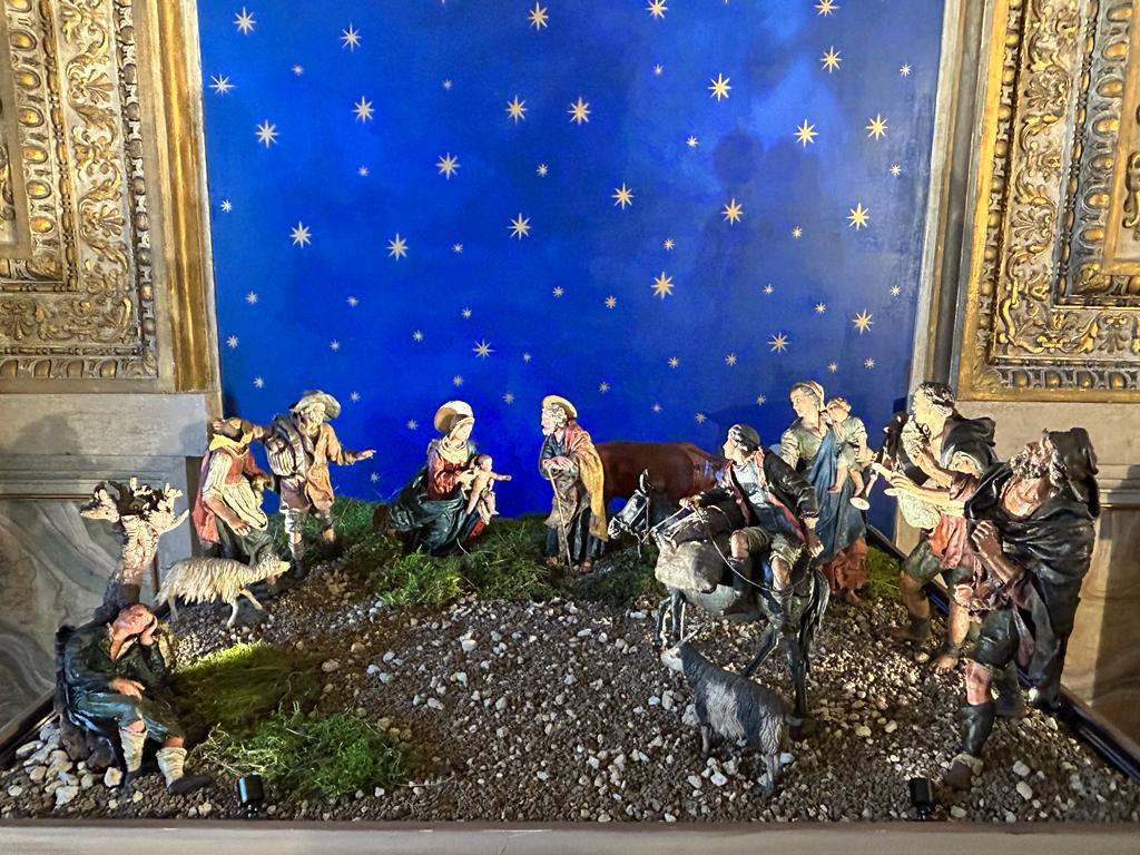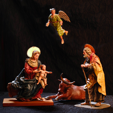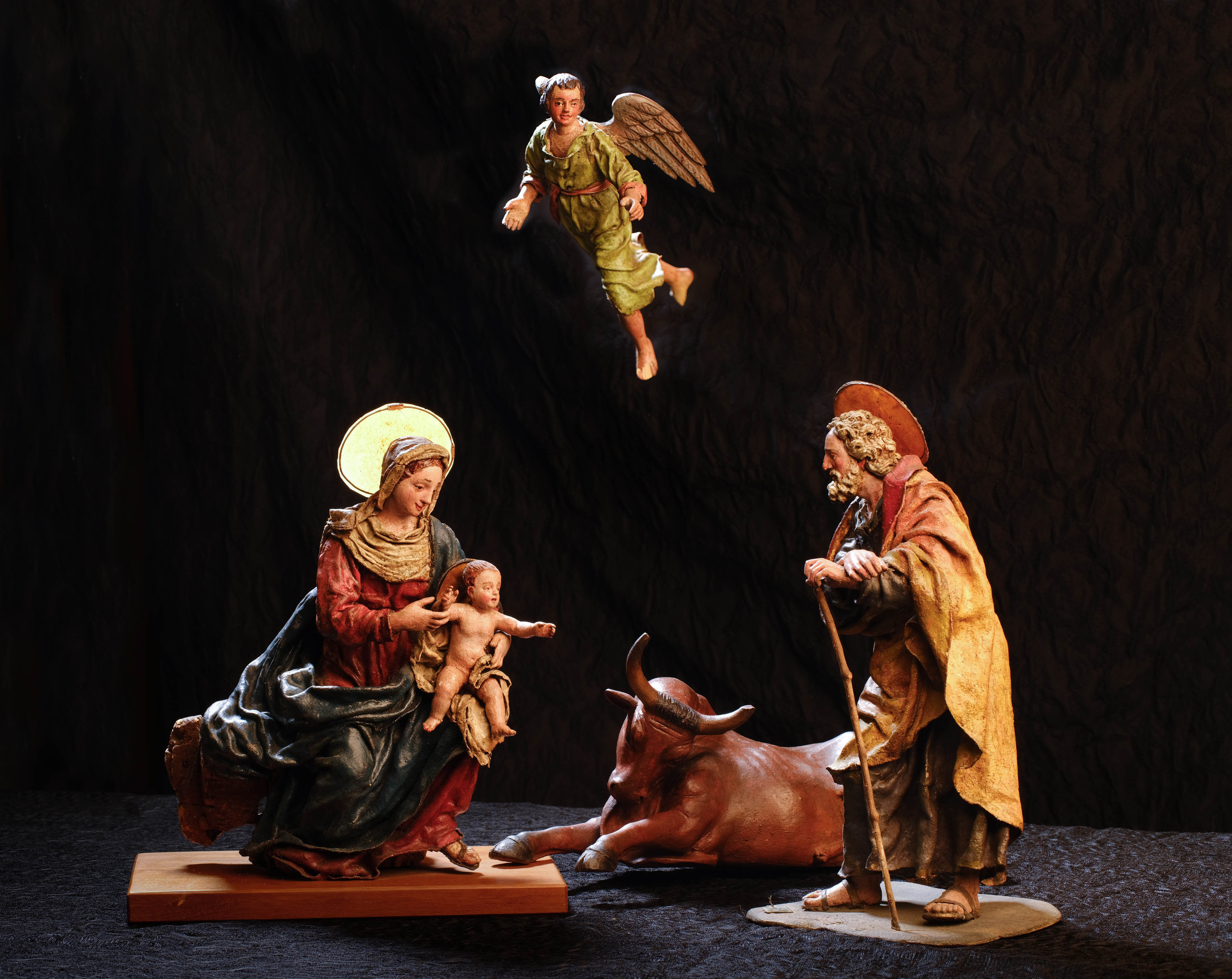 Le statuine del presepe, opera del celebre artista siciliano Giovanni Antonio Matera, risalgono alla fine del ‘600. L’artista, originale creatore di una tipologia iconografica che avrà numerosissimi imitatori, per modellare i suoi pastori usava materiali poveri: legno, tela e colla. Intagliava viso, braccia e gambe, spruzzando appena il corpo, fatto di legno di tiglio, quindi immergeva piccole strisce di telo di lino in una mistura di colla e gesso, variamente colorata e le applicava ancora bagnate sul corpo delle statuine. La colla indurendosi conferiva alle vesti un aspetto plastico e armonioso, vivacizzato da ricchi colori.