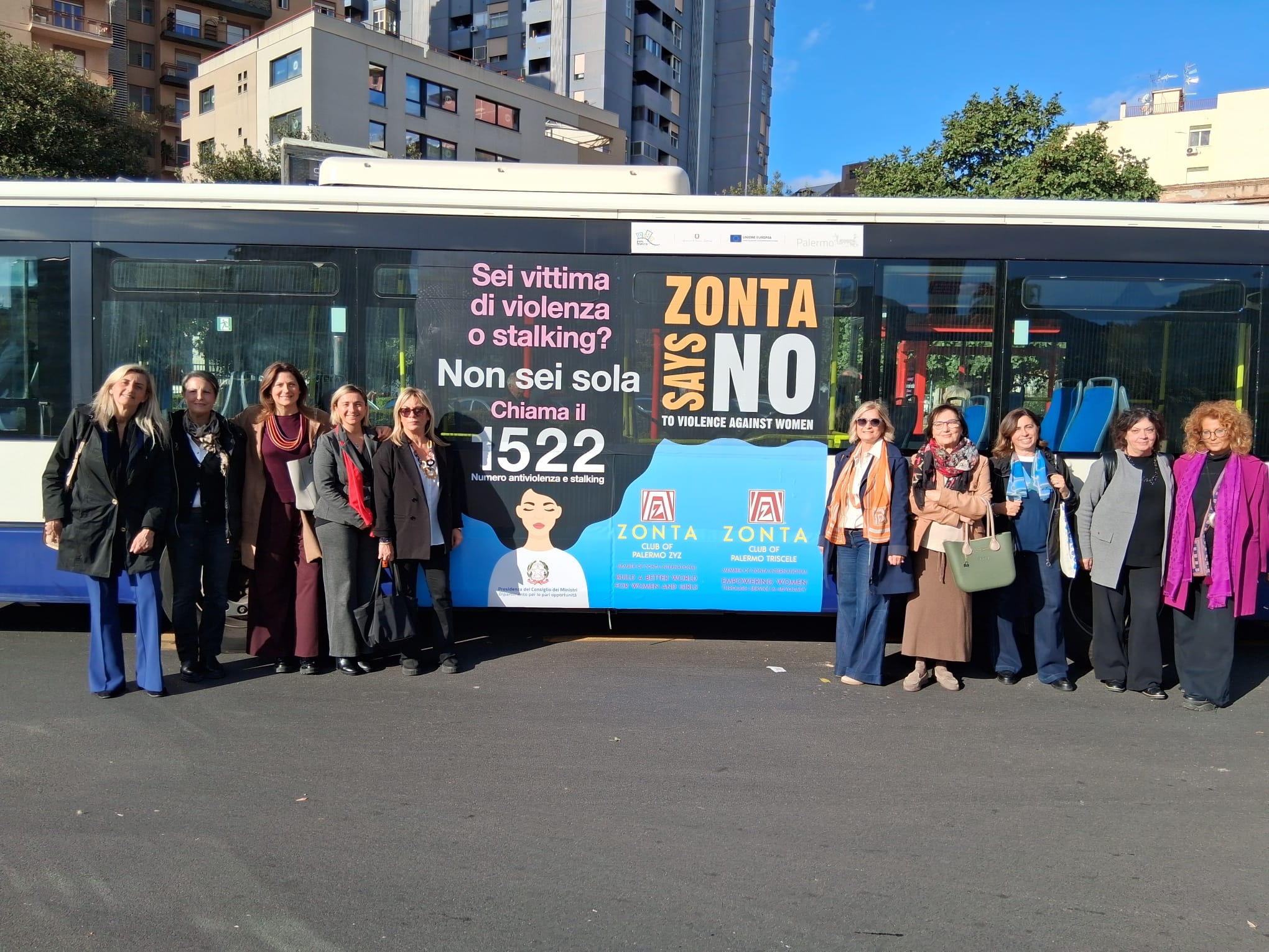 La campagna ZONTA SAYS NO TO VIOLENCE AGAINST WOMEN 2024 arriva nelle strade di Palermo con il messaggio Sei vittima di violenza o stalking? Non sei sola chiama il 1522 apposto nei pannelli di nove pensiline di fermata AMAT dipinte di rosso, una per ognuna delle otto Circoscrizioni cittadine, oltre quella di piazza Giovanni Paolo II, nelle quali saranno messe pannellature con storie di donne palermitane di valore che sono state impegnate nella vita pubblica politica, culturale e sociale.