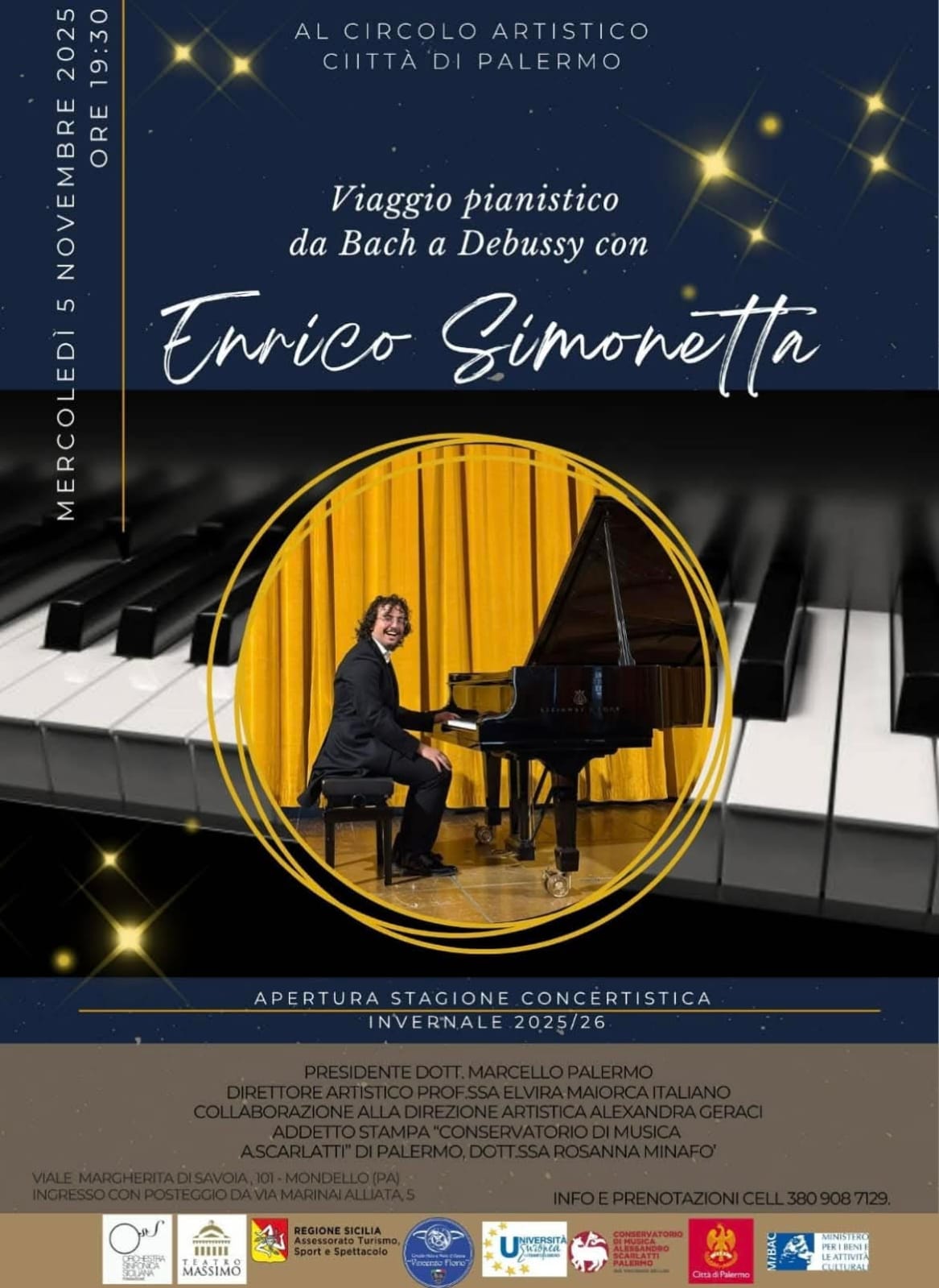 Il Circolo Artistico Città di Palermo, fondato nel 1882, con il presidente dott. Marcello Palermo, organizza in occasione della inaugurazione della Stagione concertistica la performance con il giovane talento Enrico Simonetta, studente del Conservatorio Alessandro Scarlatti di Palermo e che quest’anno è stato scelto come solista per l’inaugurazione della Stagione concertista dell’Istituzione AFAM durante il concerto al Teatro Massimo di Palermo. La stagione curata dalla Prof.ssa Elvira Maiorca Italiano vuole essere un momento in musica davvero speciale, pensato per regalare arte, musica e parole. Si conclude così il ciclo delle attività all’interno del Circolo che porta la firma della direzione artistica della professoressa Elvira Maiorca Italiano, la collaborazione artistica Alexandra Geraci, la segretaria Domenico Ruisi. Sarà una serata speciale, un vero viaggio pianistico che abbraccerà i secoli — dal Seicento al Novecento — tra stili, colori e gusti musicali diversi. Un’occasione per ritrovarci, condividere emozioni e dare il benvenuto insieme a un nuovo anno di musica, arte e amicizia.