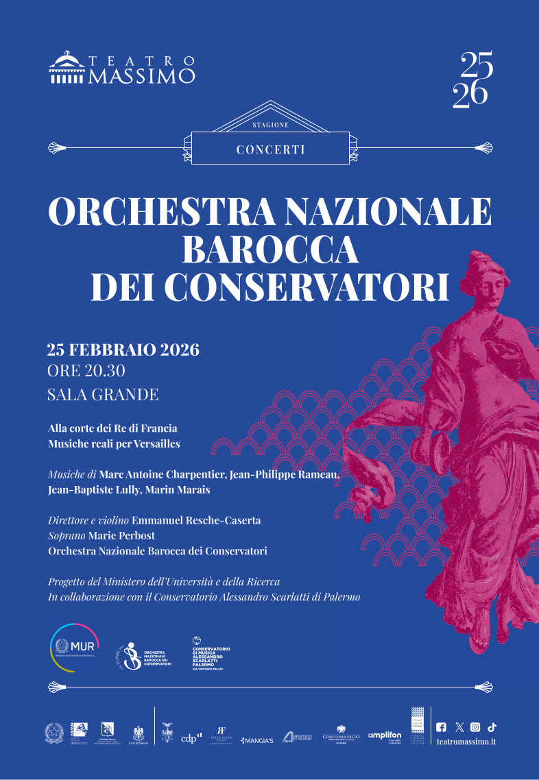 Il concerto al Teatro Massimo celebra il decimo anno di attività dell’Orchestra Nazionale Barocca dei Conservatori, nata come progetto artistico-didattico del Ministero dell’Università e della Ricerca (MUR) in collaborazione con il Conservatorio “Alessandro Scarlatti” di Palermo. Dall'esordio nel 2016, l'ensemble è oggi un punto di riferimento per l'esecuzione filologica su strumenti storici e ha collezionato traguardi prestigiosi: dalle partecipazioni a Expo Dubai 2020 ed Expo Osaka 2025, fino alle collaborazioni con il Festival dei Due Mondi, lo Styriarte in Austria e le Settimane Barocche di Brescia. Da otto anni partecipa alle stagioni concertistiche della Fondazione Teatro Massimo di Palermo. Recentemente ha ottenuto premi dalla critica internazionale per l'incisione discografica (etichetta Glossa) di arie inedite di Francesco Gasparini con il controtenore Filippo Mineccia, progetto approdato anche su Rai5. Info:https://www.