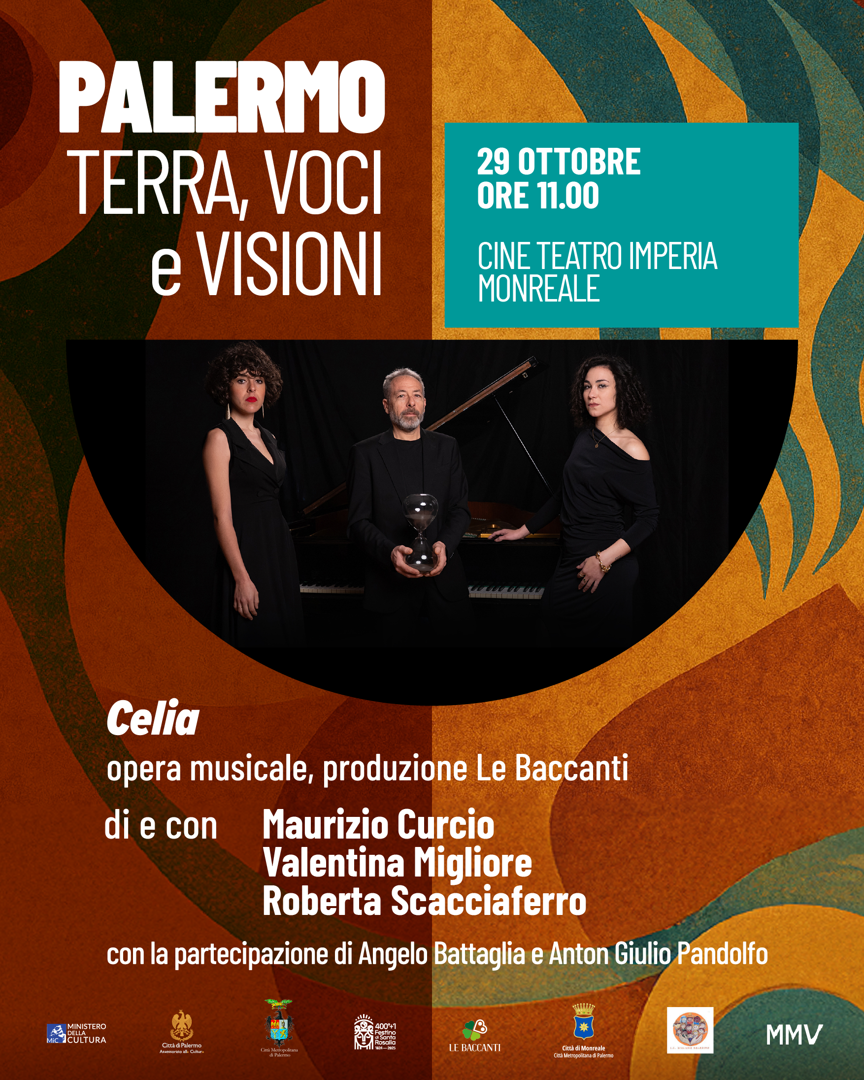 Il 29 ottobre alle 11.00 al Cineteatro Imperia a Monreale – il concerto “Celia” di e con Maurizio Curcio, Valentina Migliore e Roberta Scacciaferro, con la partecipazione di Angelo Battaglia e Anton Giulio Pandolfo, produzione Le Baccanti.